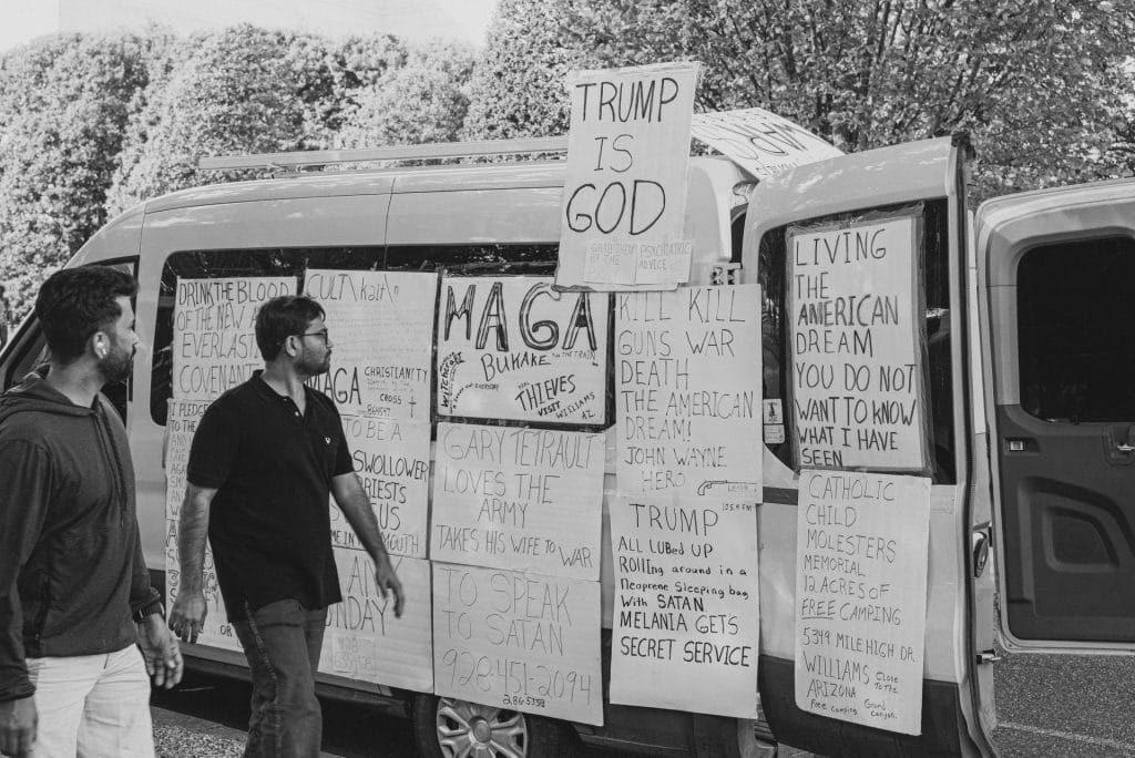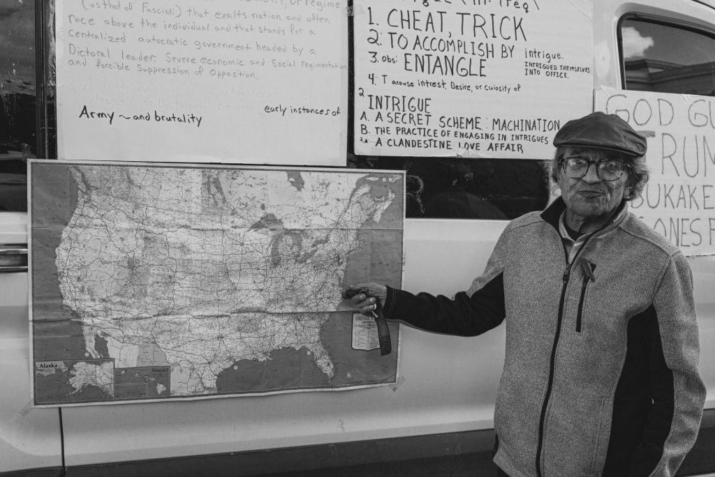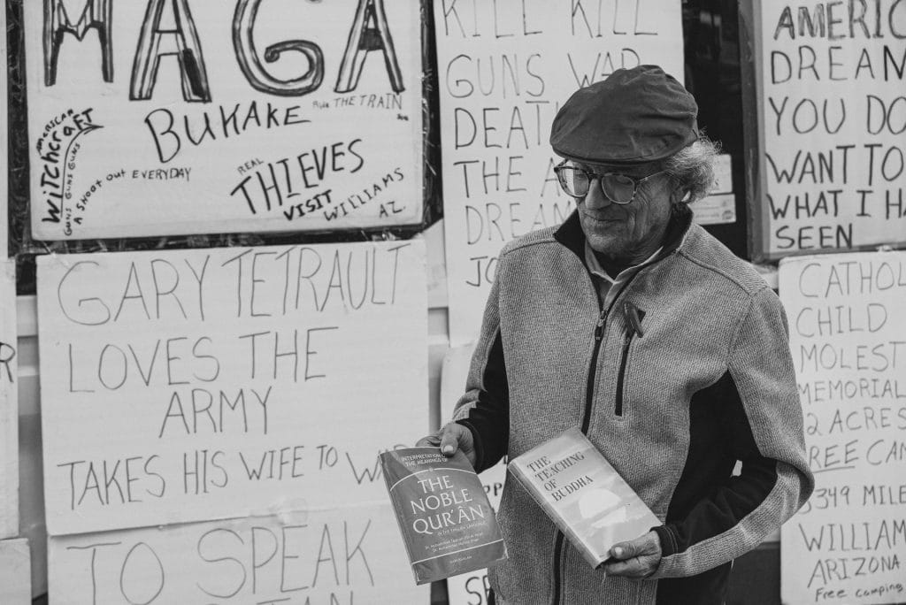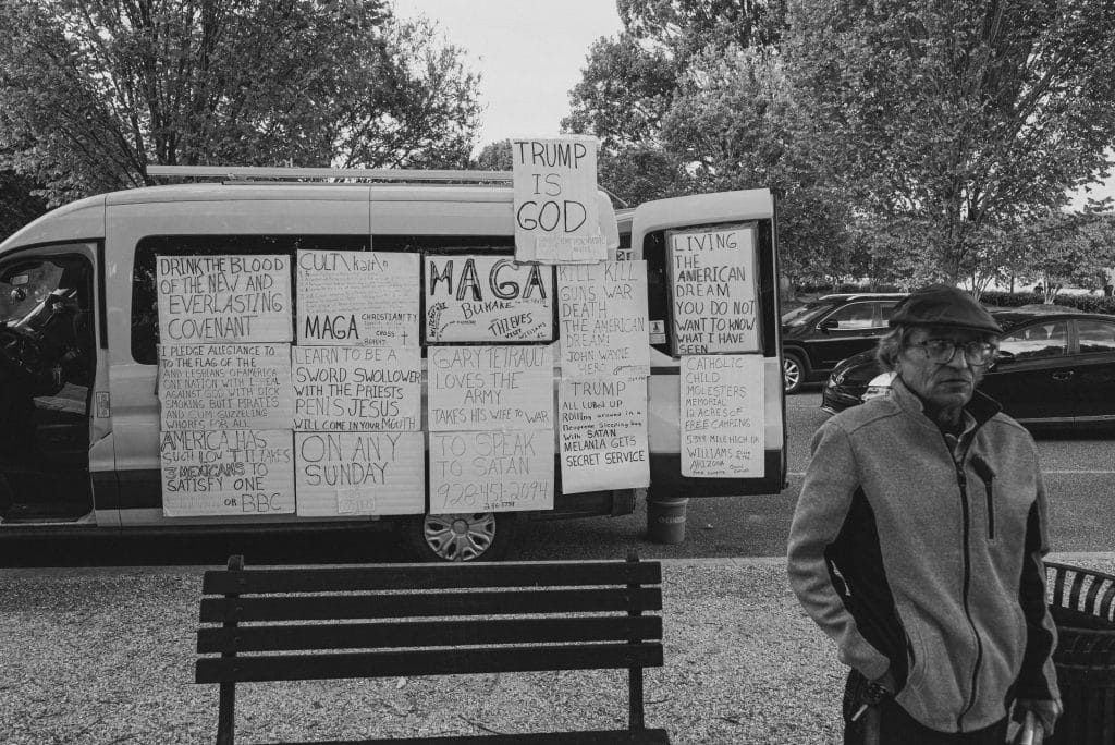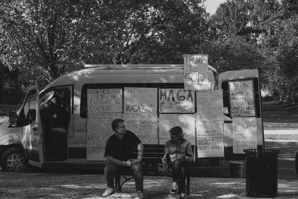 I came to the other side of the van to see a slight, grizzled man chatting with a younger man. From what little I overheard, they’re discussing whether the man’s signs will be effective. The grizzled man tells the younger man that they got him to come over and engage. The young man admits that they felt like a literal sign to perform ministry. They continued to chat and he was thoughtful in his responses, even though he seemed out of his depth at times.