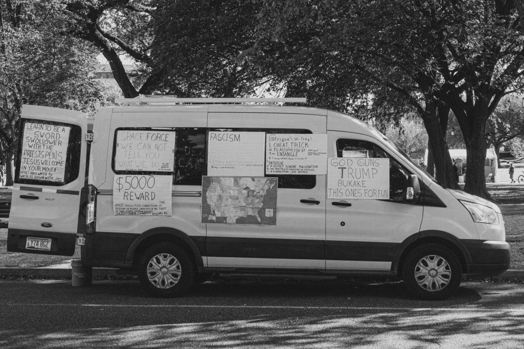 I was on the street side though, so I couldn’t see the van’s owner. Curiosity yanked me over there, because I couldn’t go any further without seeing what the person behind all this had in mind. As I parked my bike once more, I noticed the people gawking. Some shook their heads. Others commented to one another, mouths agape, about the horrid slogans.